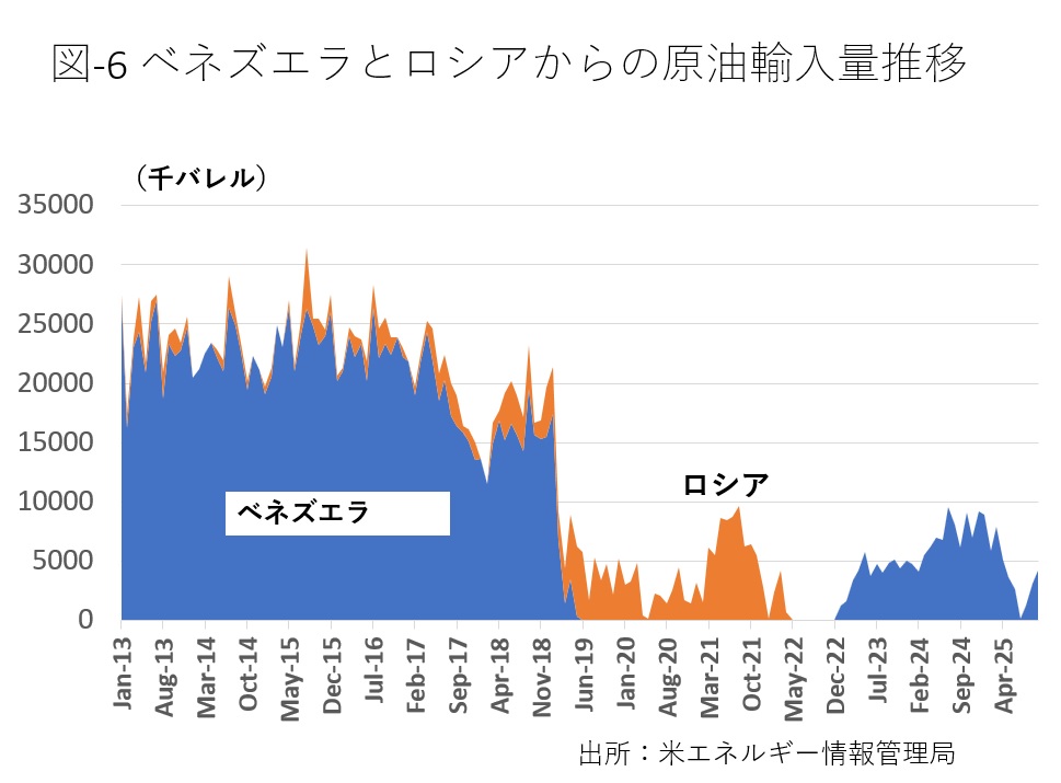 シェール原油は揮発成分が多い軽質油なので、これまでベネズエラの重質油を混ぜて精製してきました。2019年にベネズエラに経済制裁した後はロシアから重質油を輸入し、ウクライナ侵攻でロシアに経済制裁した後は、またベネズエラから輸入しました。山本隆三・常葉大名誉教授が作成した下のグラフを見てください。