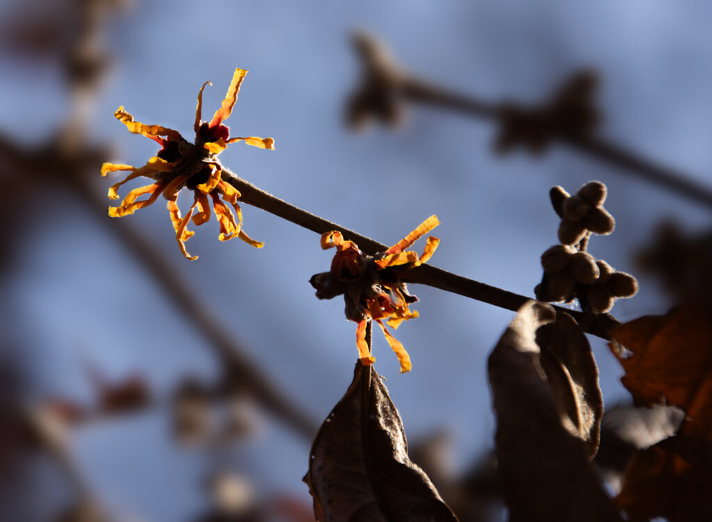 野菜と花の歳時記 アカバナマンサク(赤花満作・赤花万作) 2026年1月31日 精兵衛 日本固有種のマンサクは明るい黄色の花ですが、赤い花の写真は仲間のアカバナマンサクです。樹高3~5mの落葉広葉樹で、晩冬の寒いうちに他の木に先駆けて花を咲かせます。長さ1~2cmの細長いひも状の花弁が特徴です。(埼玉県 精兵衛)」