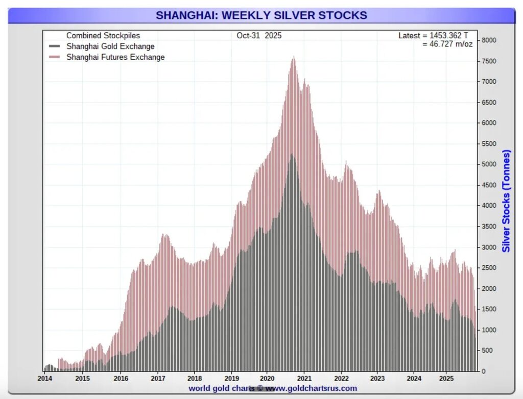そこで近年、中国・上海の先物取引所の倉庫が注目され、中国からロンドンへの輸出が増えていましたが、その上海の在庫も不足し始めました。下のグラフは上海取引所の在庫の動きです。余裕が乏しくなっていることが分かります。