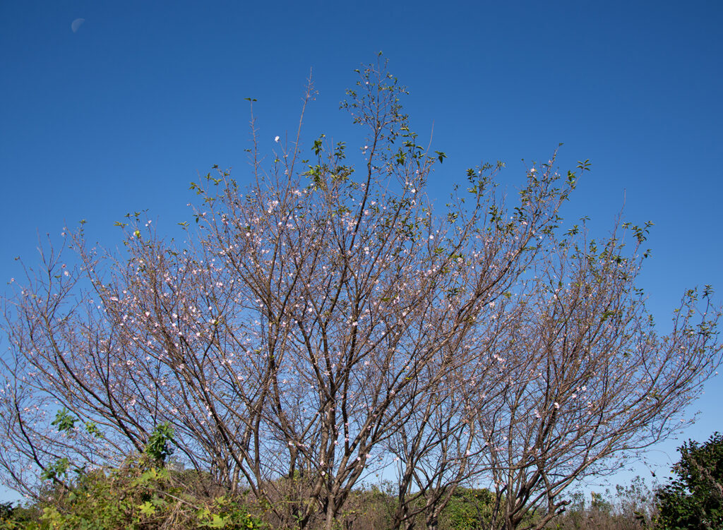 野菜と花の歳時記 ジュウガツザクラ(十月桜) 2025年11月15日 精兵衛 十月桜は3分の1が秋に咲き、残りは春に咲く二度咲きの桜です。春は他の桜と同様に開花は短期間ですが、秋は10月から12頃までと長期間です。一気に咲く春の桜の華やかさはありませんが、やや小ぶりで細身の花弁の八重咲き桜が、少しずつひっそりと咲き続けます。(埼玉県 精兵衛)」