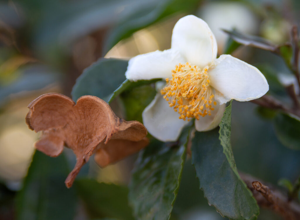 椿の仲間のチャノキです。炭火を長持ちさせるように、炭火に灰をかぶせ、その上に木枠に和紙を貼った「助炭」を載せて新葉を乾燥したのが碾茶、これを粉末にしたのが抹茶、蒸して手揉みしたのが玉露、玉露に準じて仕上げたのが煎茶です。成葉を煎茶同様に仕上げたのが番茶、茶葉を軽く発酵させたのがウーロン茶、完全に発酵させたのが紅茶です。種子は椿と同じように絞って油を採るのにも使われます。(埼玉県 精兵衛)