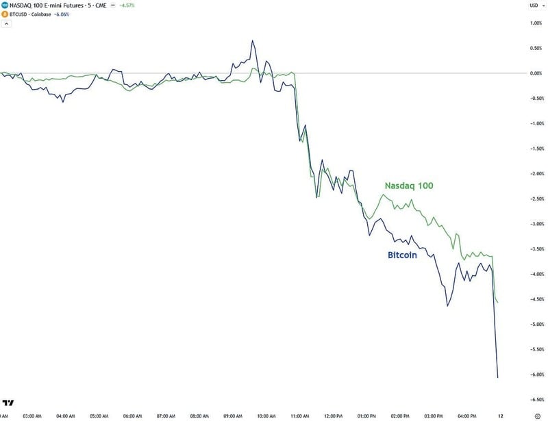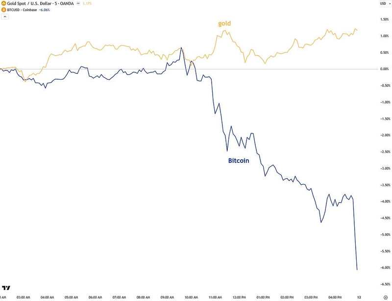 金の分析家のジェシー・コロンボ氏は、トランプ大統領の「関税100%」発言によって、暗号通貨と株式が、それぞれどのように動いたかを調べました。下のグラフは新興企業の株式指標である「ナスダック100」とビットコインの値動きを表したものです。横軸の目盛りは10日午前0時から16時までの時刻、縦軸の目盛りは0.5%刻みの値下がり幅です。