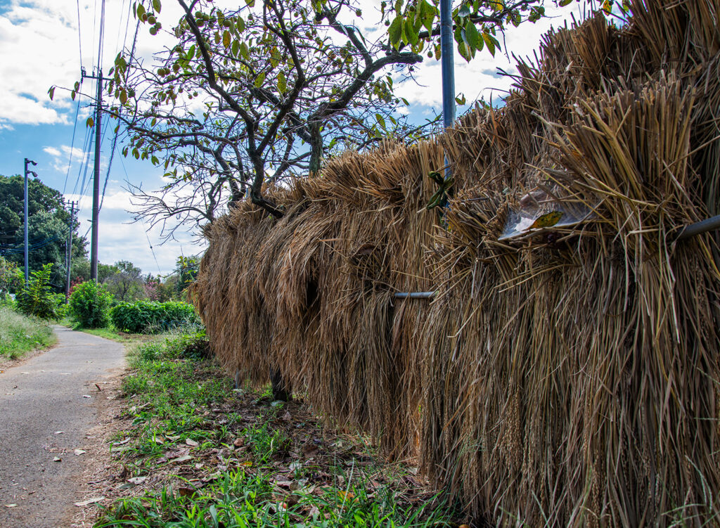 野菜と花の歳時記 稲架掛け(はざがけ)のある風景 2025年10月4日 精兵衛 コンバインで稲刈りと同時に脱穀までやってしまう現在ではあまり見かけなくなってしまった稲架掛けです。お米の味は品種にもよりますが、米粒全体をゆっくり均一に乾燥させると、美味しくなると言われます。そのために刈り取って脱穀するまでの間、稲架(はざ)に掛けて自然乾燥する昔ながらの方法です。私が育った広島では「はざ」ではなく「はぜ」と言っていました。地方によって様々な呼び名があるようです。(埼玉県 精兵衛)」