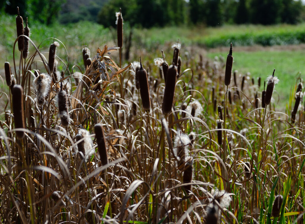 ガマは広く温帯から熱帯の湿地に分布する抽水植物(水底に生える植物)で、地下茎を発達させて群生します。 花期は6〜8月で、茎の先端に雄花群、その下に雌花群を付け、雌花は成熟すると太い褐色の穂になります。秋に穂は綿状になって崩れ、飛散します。蒲の穂の独特の形状が語源となったものに蒲鉾、蒲焼、蒲団(蒲団)があり、「蒲」の文字が使われています。(埼玉県 精兵衛)
