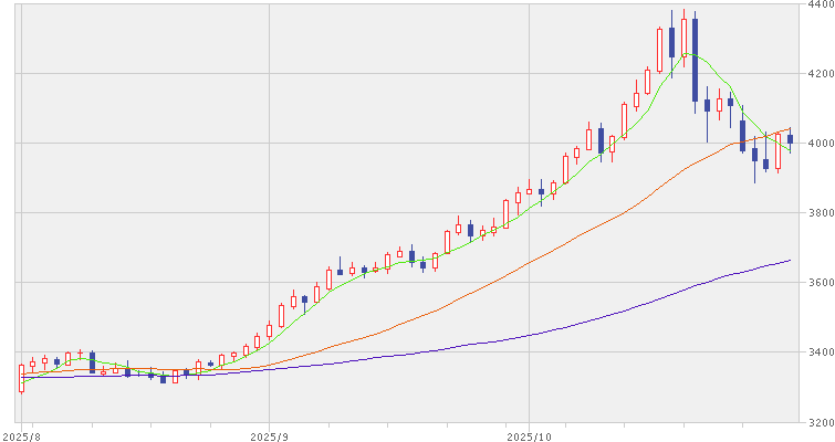 今週のロンドン市場で、現物の金は1オンス(約31g)=4002ドル近辺で取引を終えました。下のグラフは、今年8月から10月末までの3か月間の日々の値動きを示したものです。値幅を示す「棒」は、形が似ているので「ローソク足」と呼ばれています。