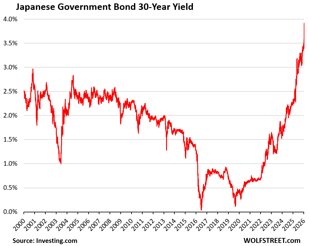 30年もの国債は3.91%に跳ね上がりました。1999年にこの国債が導入されて以来、の最高記録です。40年もの国債は4.22%と、史上初めて4%の大台を超えました。発行量が多い20年もの国債は3.48%、指標となる10年もの国債は2.33%と、やはり27年ぶりの高水準になりました。