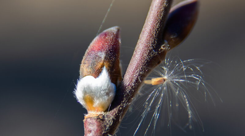 ネコヤナギの花穂が鱗片を脱いで、身体を現